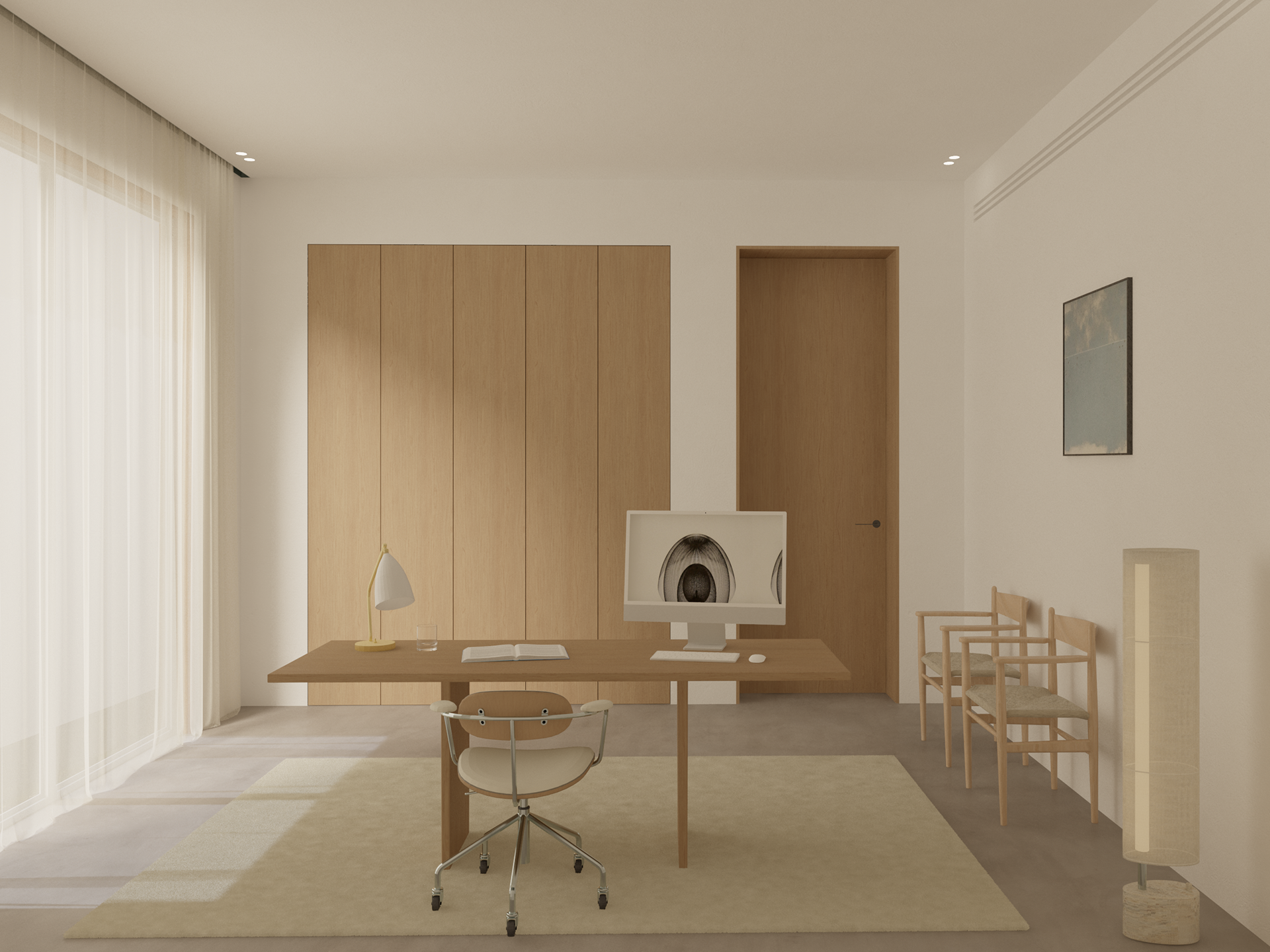 A calm and functional workspace designed with attention to light, proportion, and material. Soft tones, natural textures, and simple forms create a comfortable environment that supports focus and everyday work.